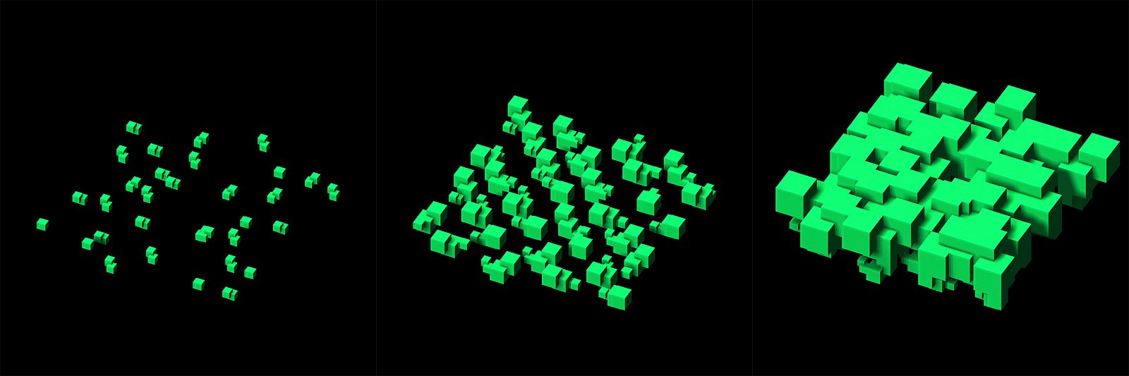 The project is a proposal for the exhibition booth of the German technology enterprise Bosch at the Expo 2000 in Hanover. It was designed as a growing, walk-in organism made of fractal geometries, which provide a maximized surface for virtually infinite displays and projections. It depicts a networked world in which spaces are continuously changed by the movement and perception of the users. Telematische Landschaft was the outcome of a long examination of domotics, the home automation of interlinked devices, that Bosch was researching and developing at the time. The project incorporated spatial mathematical models such as the Menger sponge, an object from fractal geometry, that is further perforated with each iteration step. While its surface is growing, the volume is simultaneously approaching zero. The Menger sponge as a theoretical model can be applied one-to-one to the idea of architecture as a communicative surface, while the volume itself becomes almost meaningless.