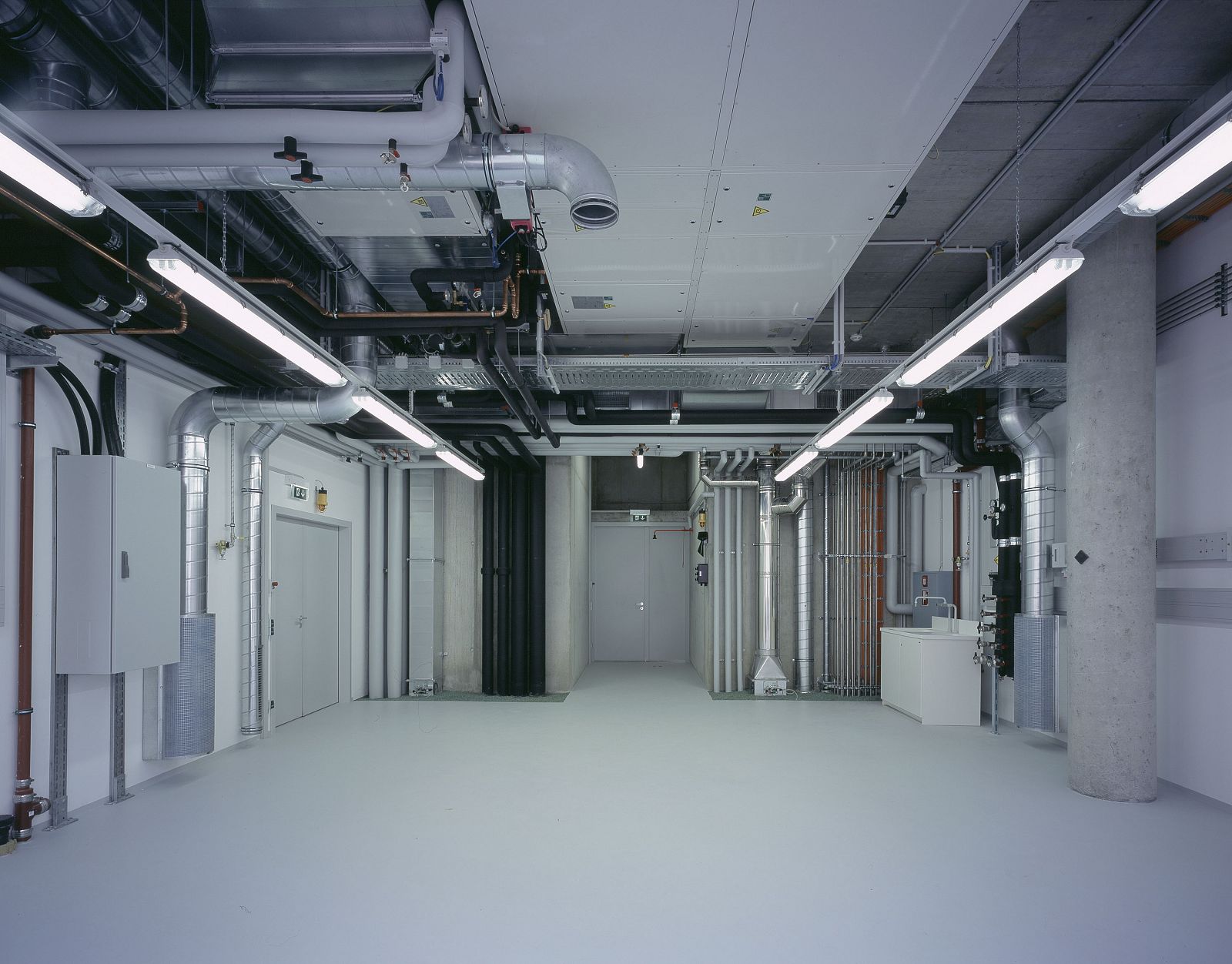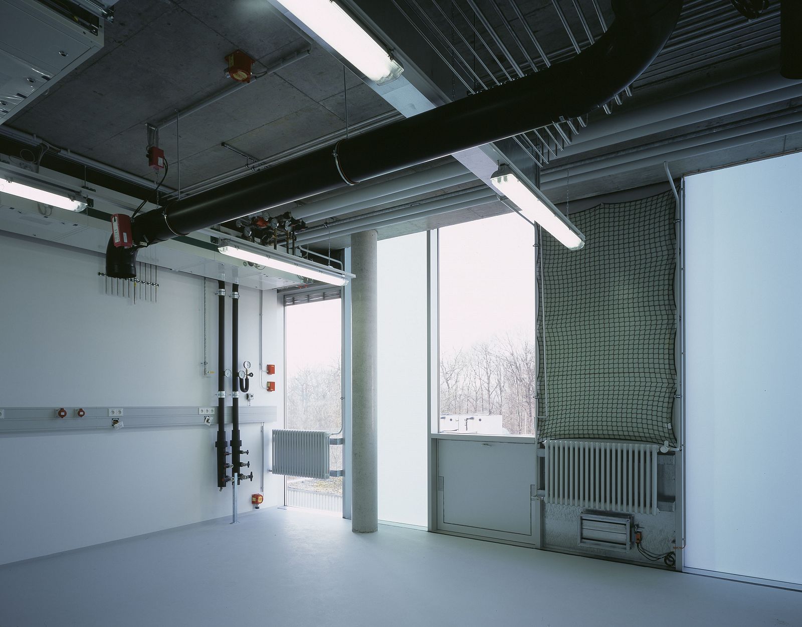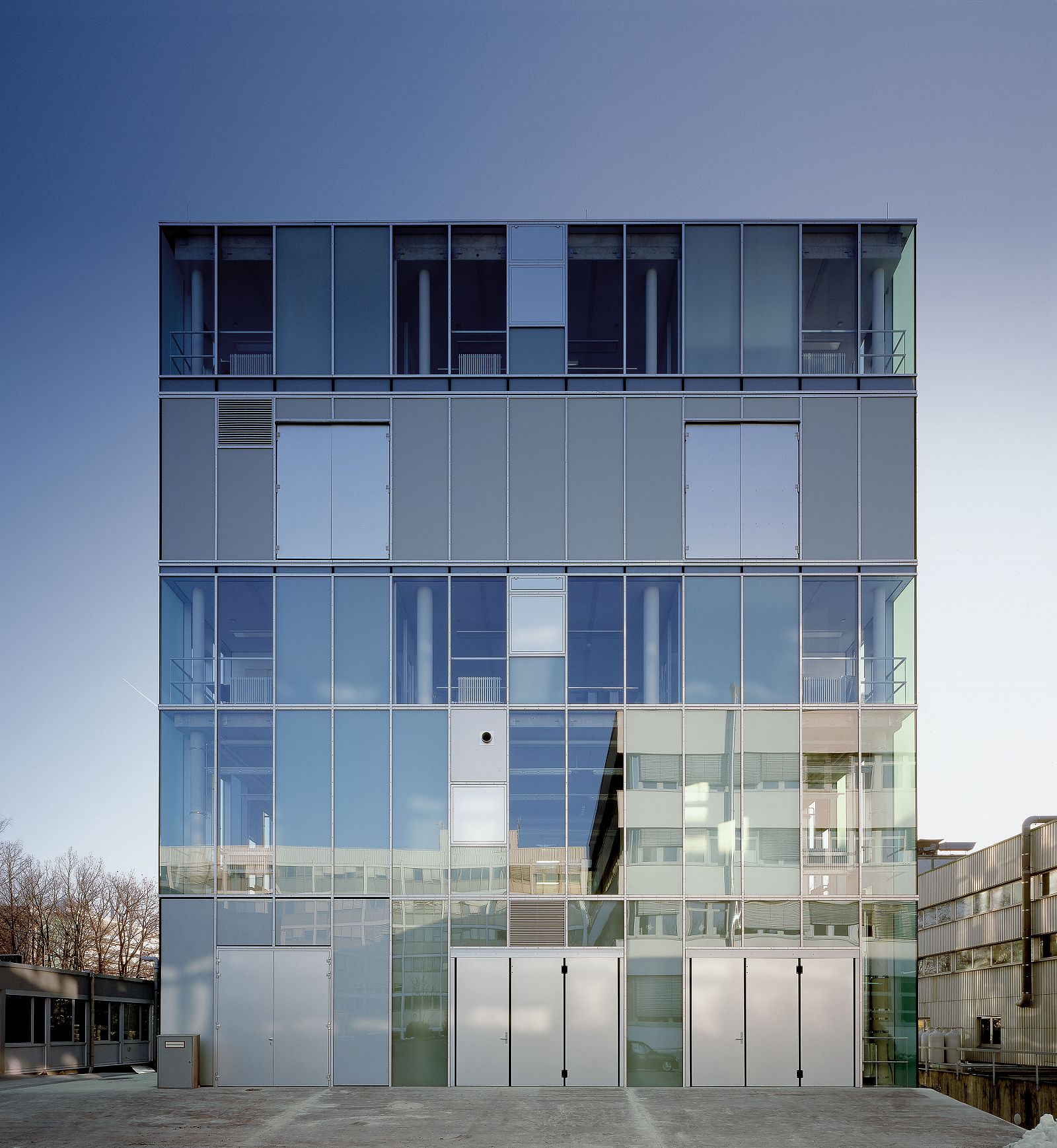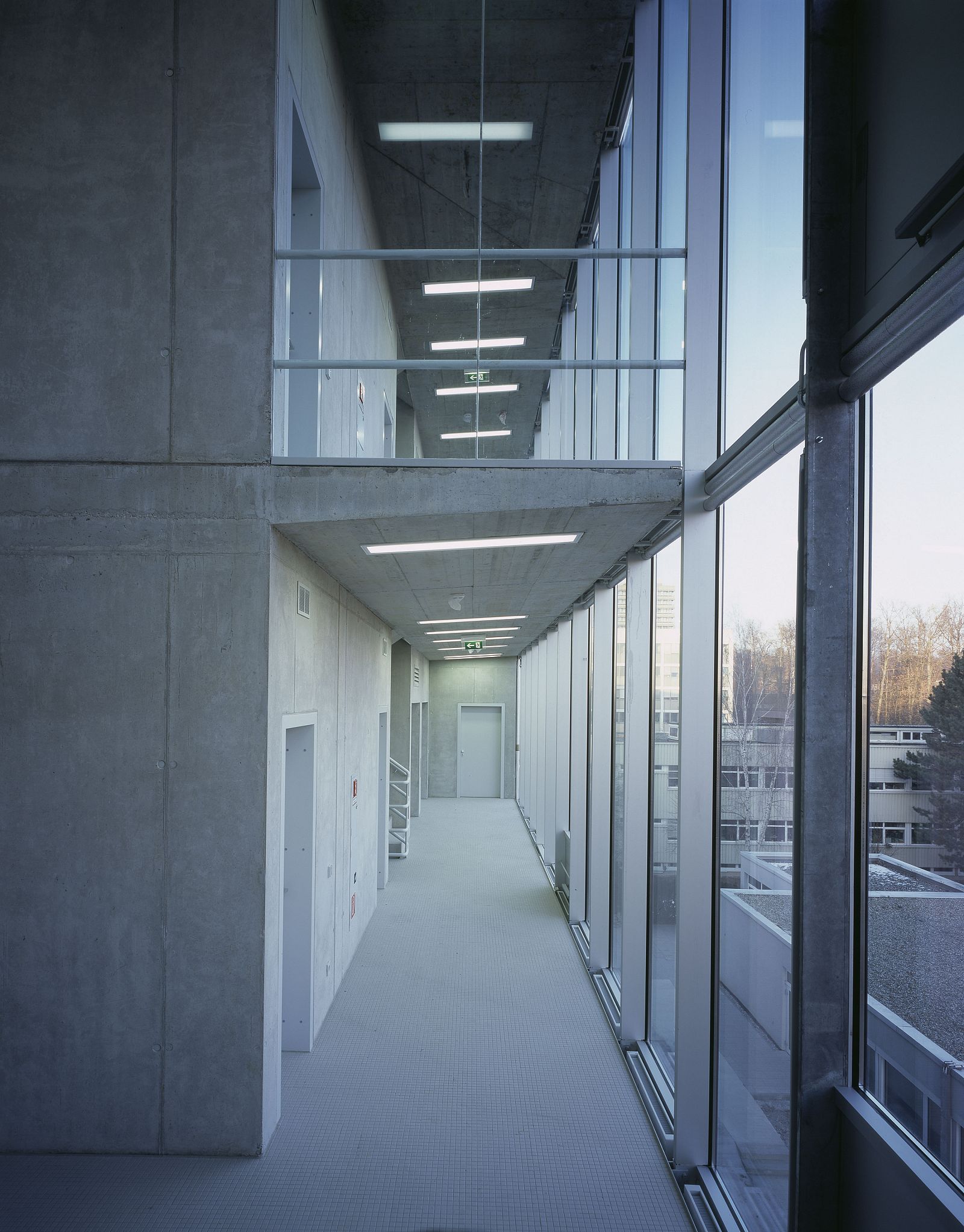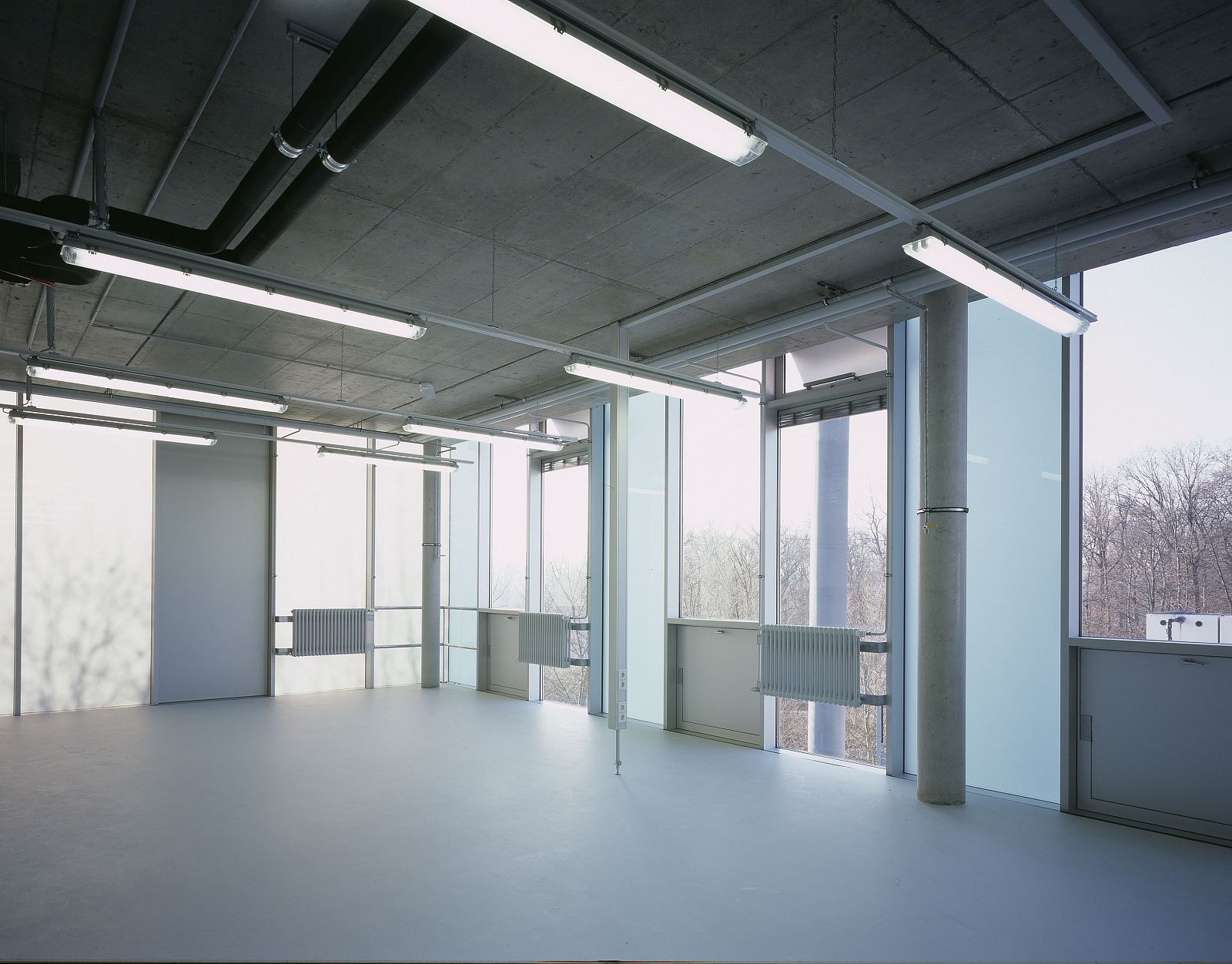 In contrast to the common area, the research area is kept as flexible as possible with all partition walls being flexibly devisable. Therefore, the space, designed in a coarse, industrial standard, can be organized due to the changing demands of work and research. With its opaque and clear glass components, the facade follows the scheme of spatial separation in private and public—high and low security standards. Hence, the facade grants visual connections between the inside and the outside as well as intimacy for the research areas.