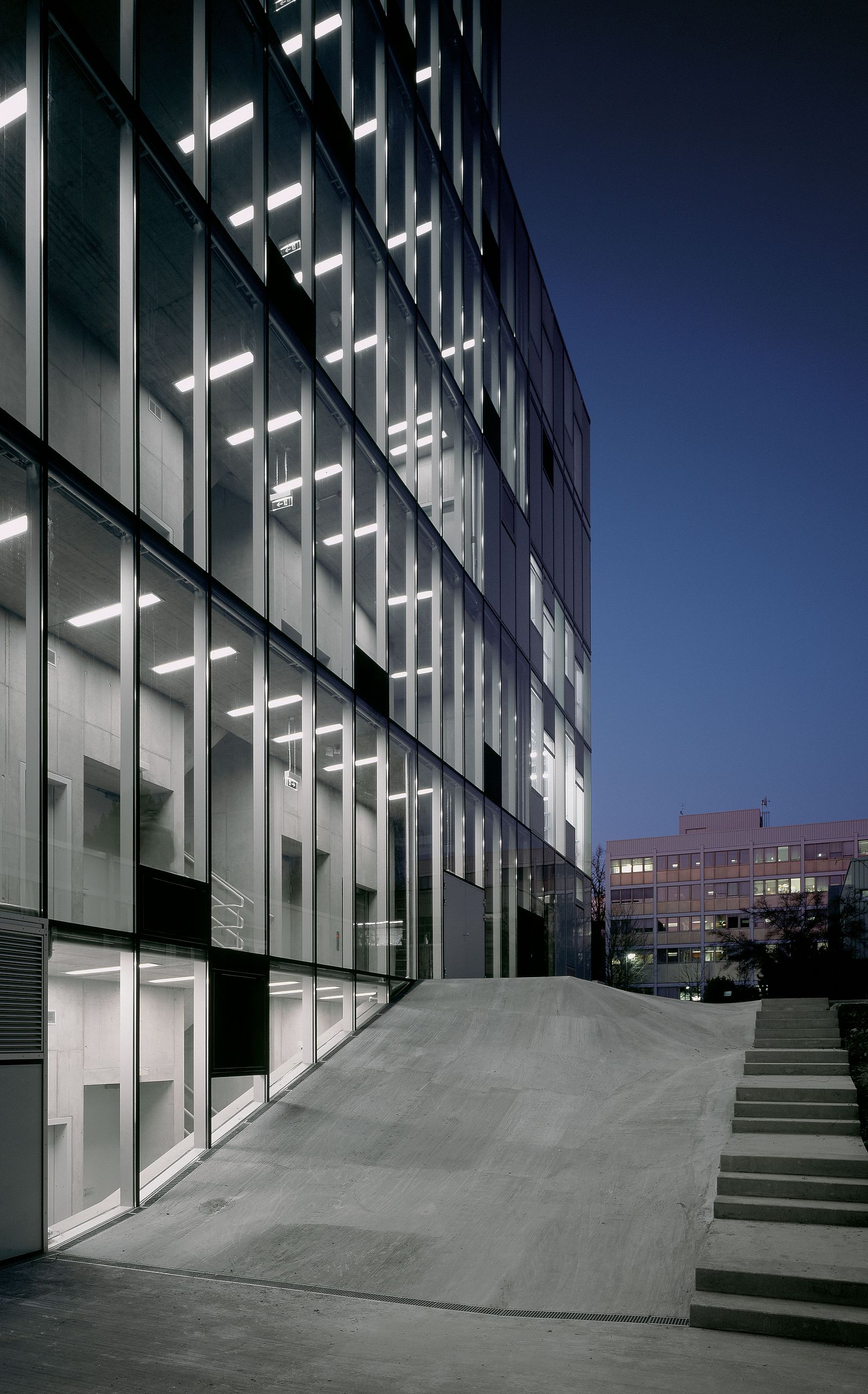 The design for the multilevel laboratory building for the German Aerospace Center (DLR) in Stuttgart is aimed at creating adaptive space that meets both the changing requirements of laboratory operations as well as the high security standards—all with minimal expanse. Further, the design had to be as compact as possible due to the limited size of the plot within the existing campus. Together, these requirements lead to the internal division of the upright standing oyster shell in a public area for circulation and recreation, and a private one for research purposes. This demand for two separated areas directly influenced the use of materials. Looking at the interior, the main core is located laterally and made out of raw concrete. The continuous floor levels make evident that the sum of the common areas, in contrast to the oyster, is not a physically coherent space. Therefore, the continuous space—for circulation and recreation—is pervaded with drawings by Büro für Konstruktivismus, creating a storyline throughout the public space.