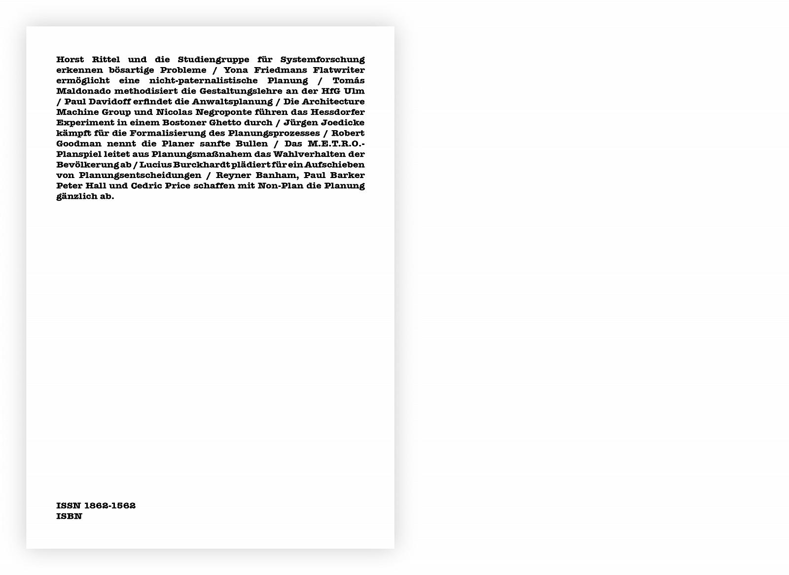 Horst Rittel and the Studiengruppe für Systemforschung identify malignant problems / Yona Friedman’s flatwriter enables non-paternalistic planning / Tomás Maldonado methods design theory at the The Ulm School of Design / Paul Davidoff invents lawyer planning / The Architecture Machine Group and Nicolas Negroponte carry out the Hessdorf experiment in a Boston ghetto / Jürgen Joedicke fights to formalize the planning process / Robert Goodman calls the planners soft cops / The M.E.T.R.O. planning game deduces the electoral behavior of the population from planning measures / Lucius Burckhardt pleads for a deferment of planning decisions / Reyner Banham, Paul Barker Peter Hall, and Cedric Price completely abolish planning with Non-Plan.