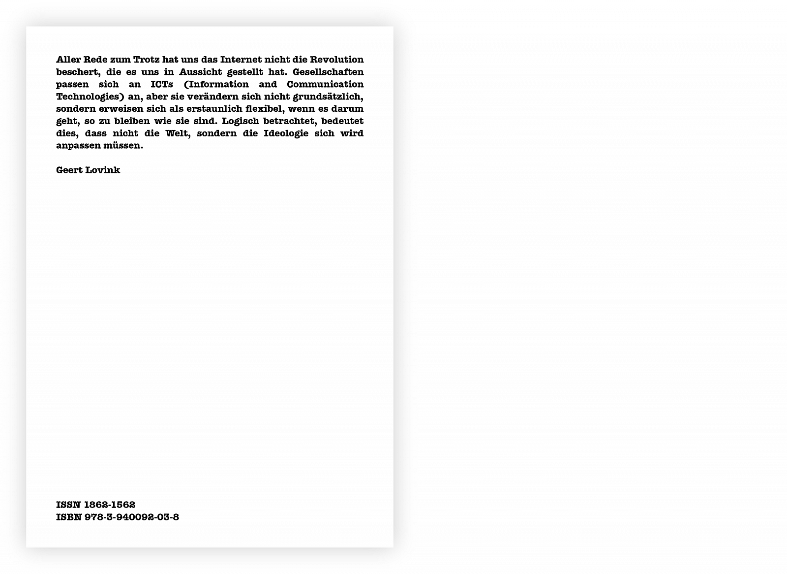 “Despite all the talk, the Internet has not delivered the revolution it promised. Societies adapt to Information and Communication Technologies (ICTs) but do not change in a fundamental way and prove remarkably flexible in staying as they are. Logically speaking, this means that the ideology, and not the world, will have to adjust.”
