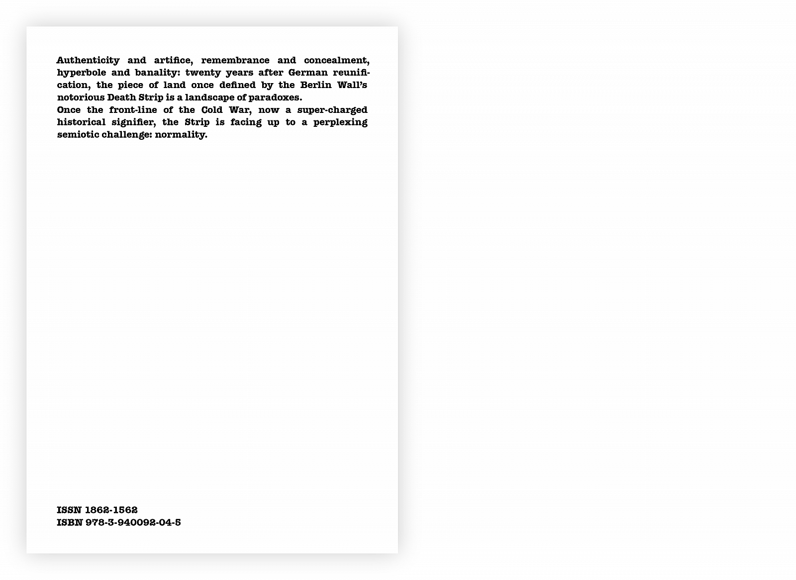 Authenticity and artifice, remembrance and concealment, hyperbole and banality: twenty years after German reunification, the piece of land once defined by the Berlin Wall’s notorious Death Strip is a landscape of paradoxes. Once the frontline of the Cold War, now a supercharged historical signifier, the Strip is facing up to a perplexing semiotic challenge: normality.
