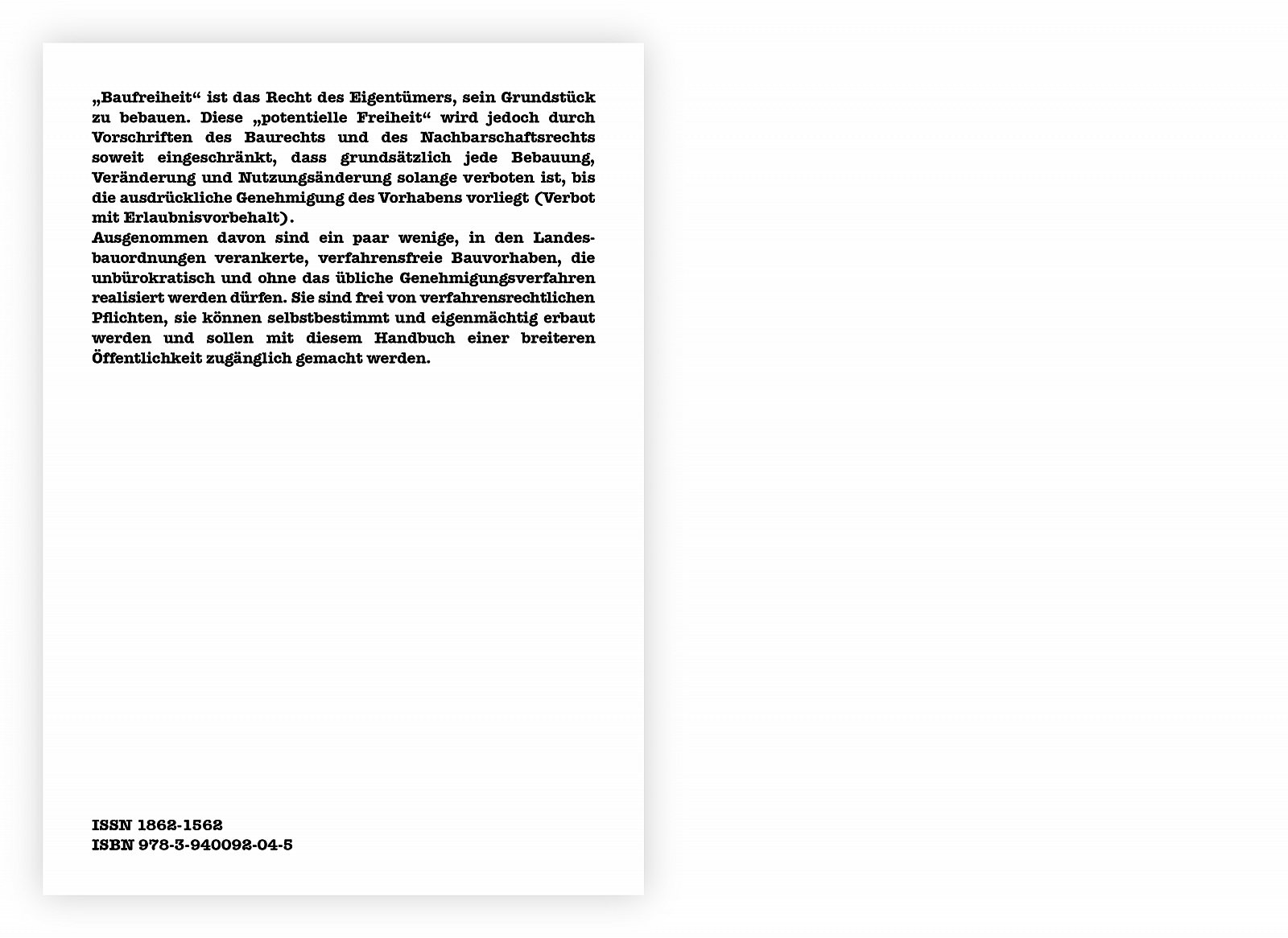 Baufreiheit (freedom to build) is the right of the owner to erect buildings on his land. However, this potential freedom is restricted by provisions of building law and neighborhood law to such an extent that, in principle, any development, alteration, or change of use is prohibited until the express approval of the project has been obtained (ban with permit reservation). Exceptions to this rule are a few construction projects that do not require planning permit, which is anchored in the building regulations of the Länder. Those projects may be realized unbureaucratically and without the usual permit procedure. They are free of procedural obligations, they can be built in a self-determined and arbitrary manner and are made accessible to a wider public through this manual.