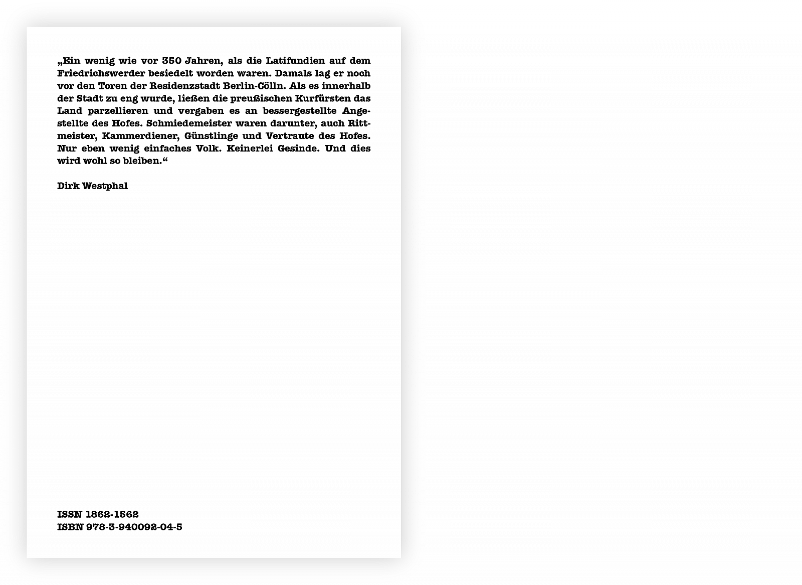 “A little like 350 years ago, when the Latifundia on the Friedrichswerder were settled. At the time, the site was still located outside the gates of the royal residence Berlin-Cölln. When it became too cramped inside the city, the Prussian elector princes had the land parceled out and gave it to better-off employees of the court. Among them were master blacksmiths, as well as master riders, chamber servants, minions, and confidants of the court. Just a few simple people. No servants of any kind. And this is likely to persist.”