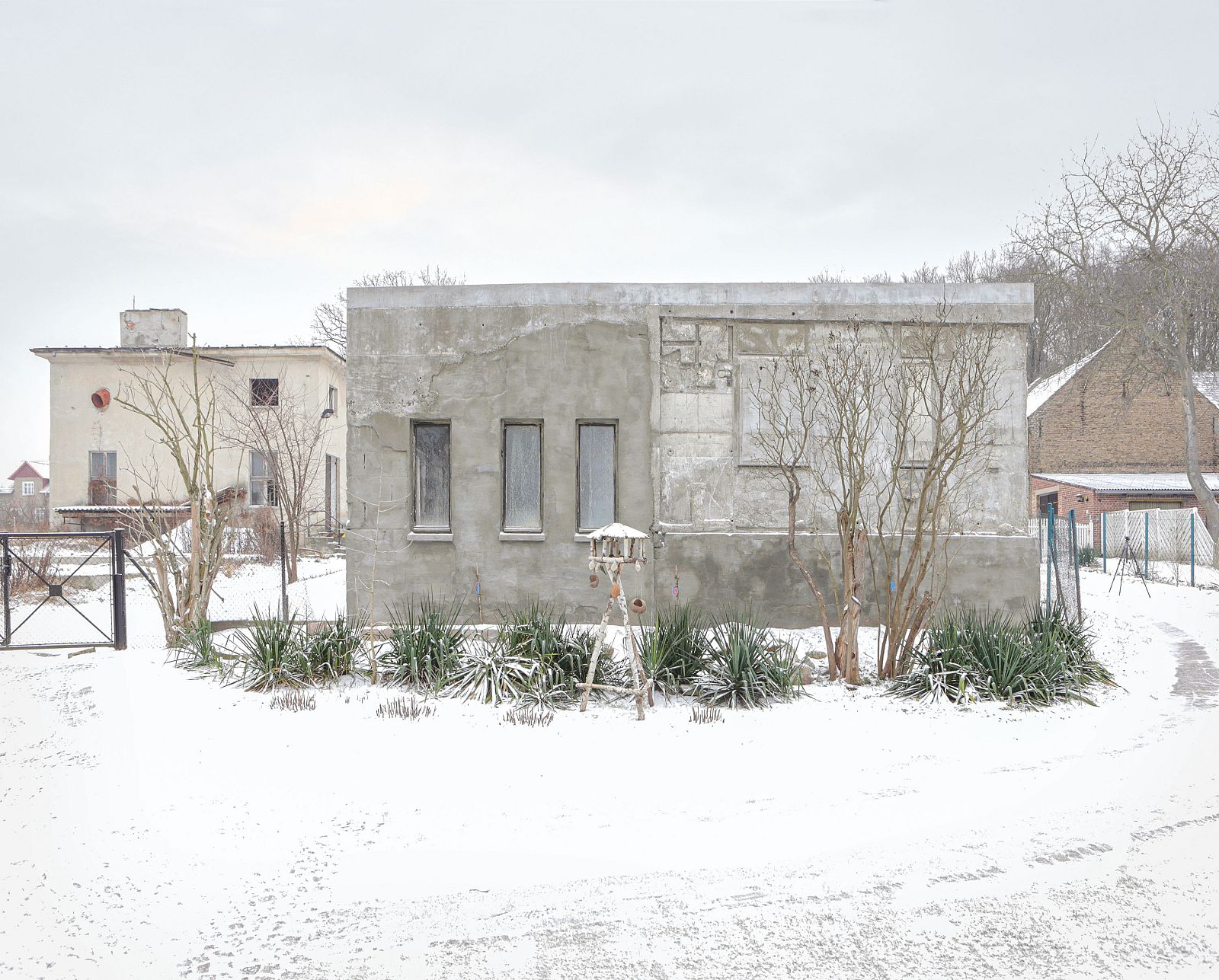 Rachel is located on the site of a former Kulturbaracke, a typical GDR typology used to bring culture to a production site. The small building was part of the industrial complex of the East German knitwear corporation Ernst Lück, located in Krampnitz, near the border between East and West Germany. Over time, the Kulturbaracke had become completely dilapidated and unusable. However, a new building was not permitted on the property. A grandfather clause (Bestandsschutzklausel) allowed modifications but only if no changes were made to the existing structure and the building would remain standing at all times. On the basis of these bureaucratic givens, the approach chosen was inspired by the eponymous English artist Rachel Whiteread, who built House (1993), a Victorian London residential building, in cast concrete.