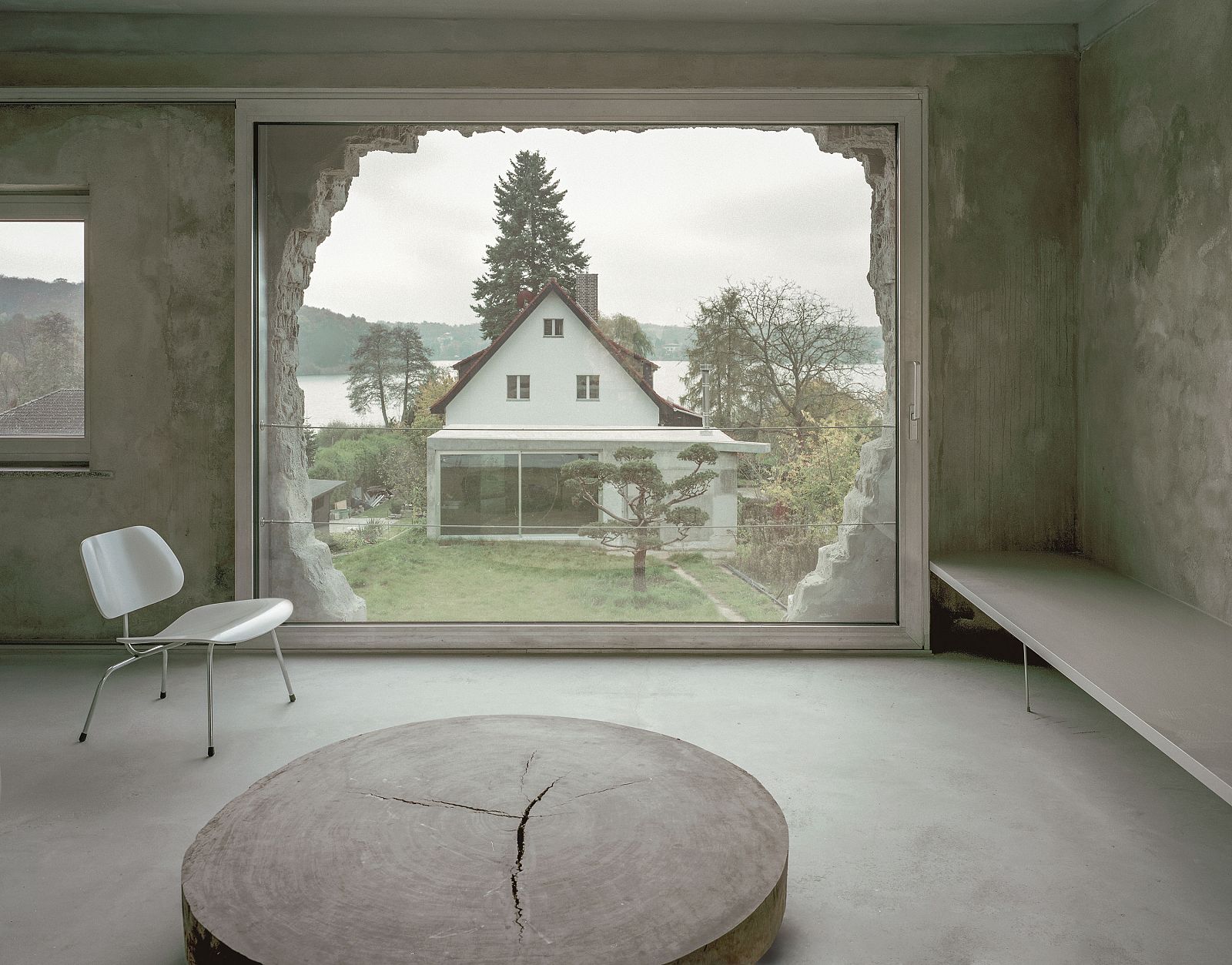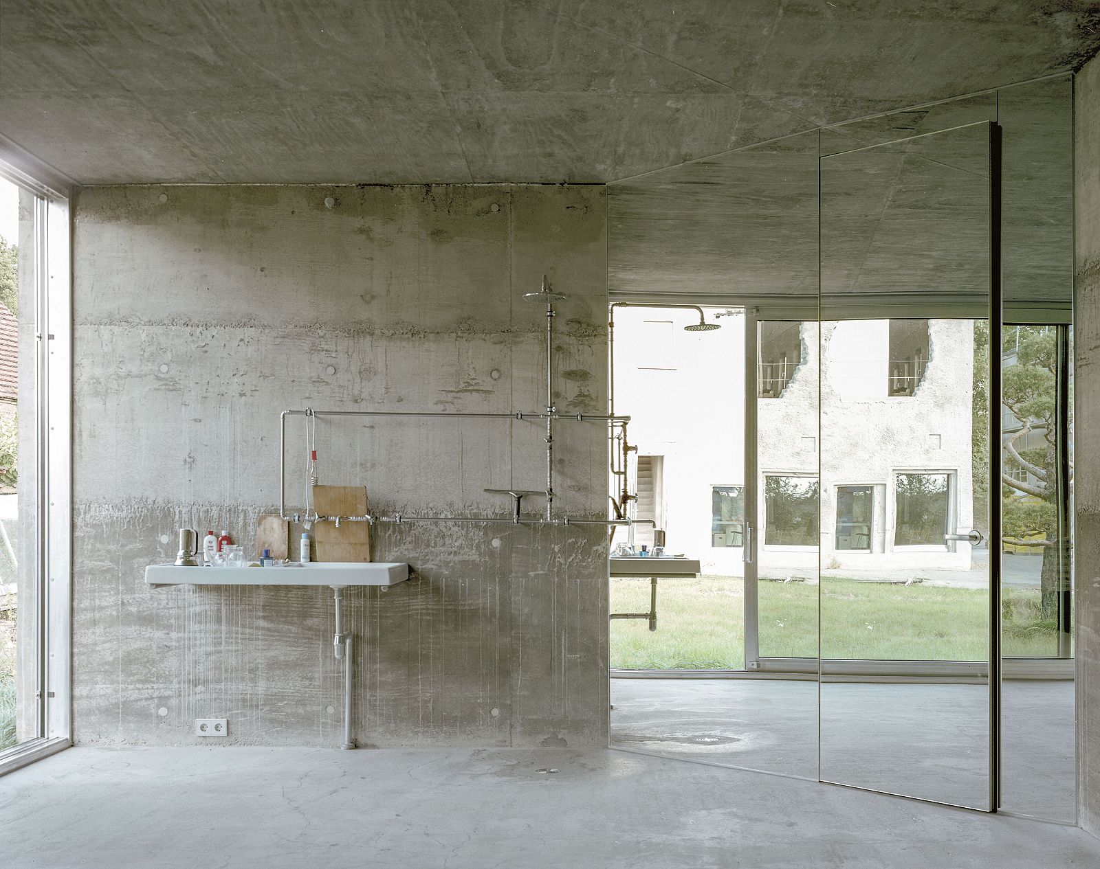 The existing walls of the building were used as formwork and cast in concrete to become the new walls of the building. As part of a workshop, architecture students from the Ostbayerische Technische Hochschule Regensburg (OTH Regensburg) built the entire formwork structure, using the existing timber framework. Abiding by the regulation, three walls were kept standing at all times. The process of casting and removing, with the resulting imprint of the wood, is proof that no wall was ever taken away. Unlike Whiteread’s project, the result was not a monolith. Instead, the poured concrete walls form the new building envelope for a guesthouse with one room. On the inside, all installations are reduced to a minimum: instead of central heating, a single oven is used to heat the small volume, allowing the building to be used from spring until autumn. The toilet is concealed behind a mirrored wall, as an alternative to building an extra room. Water is carried through exposed pipes and is heated in a small boiler to use for the shower and sink, which occupy a small corner of the room. A large sliding glass element fills the previously missing parts of the ruined structure. Spanning from floor to ceiling, the glass element opens the space to the adjacent garden and offers the view to the neighbor: 0131 Antivilla.