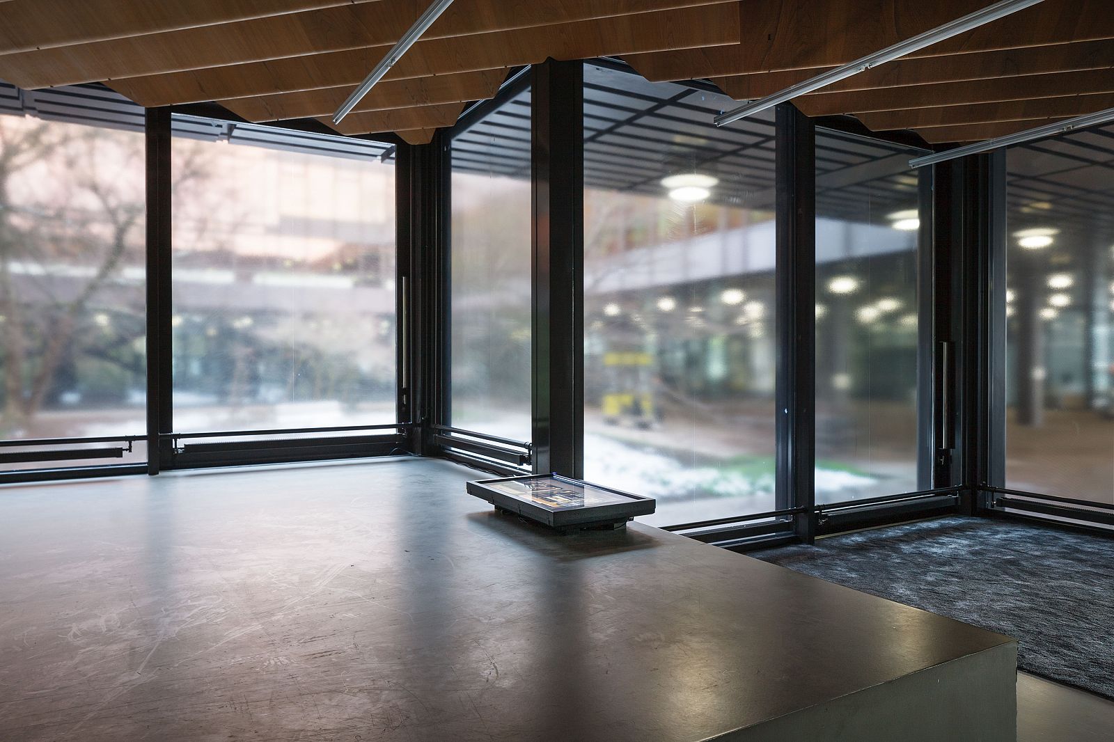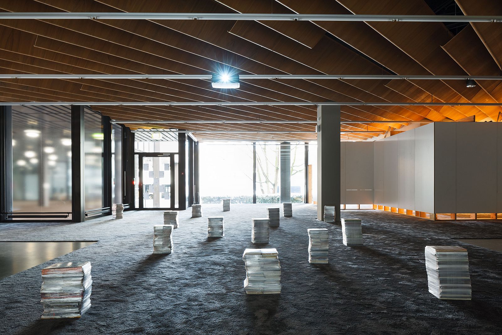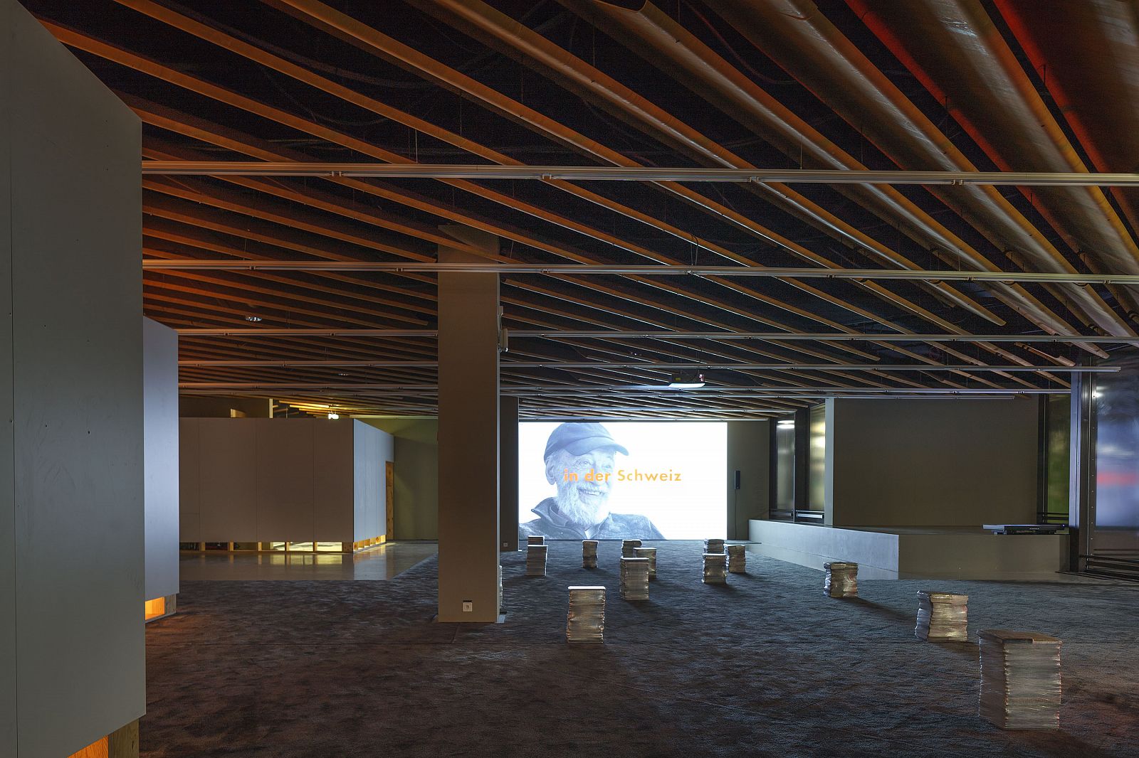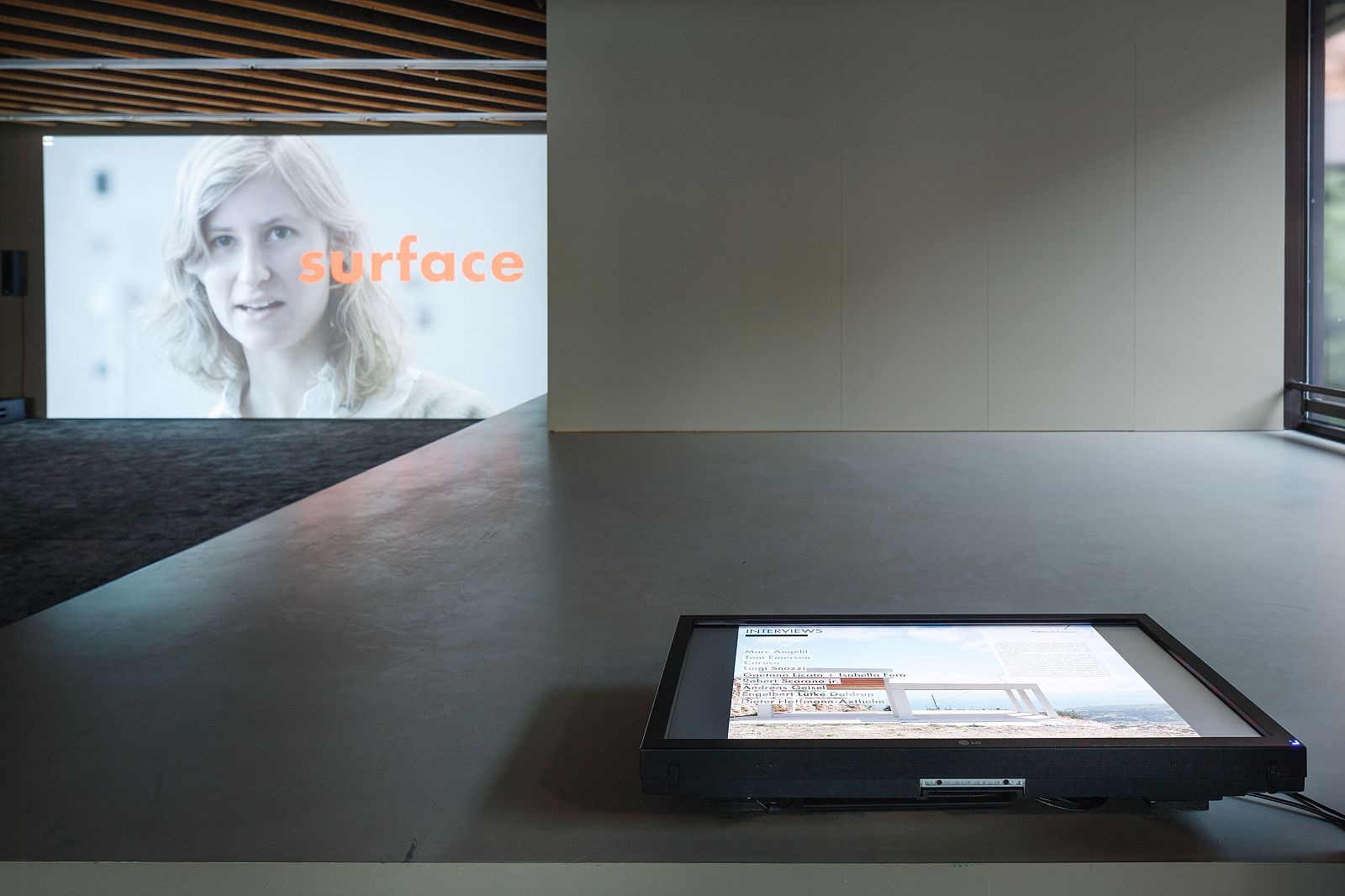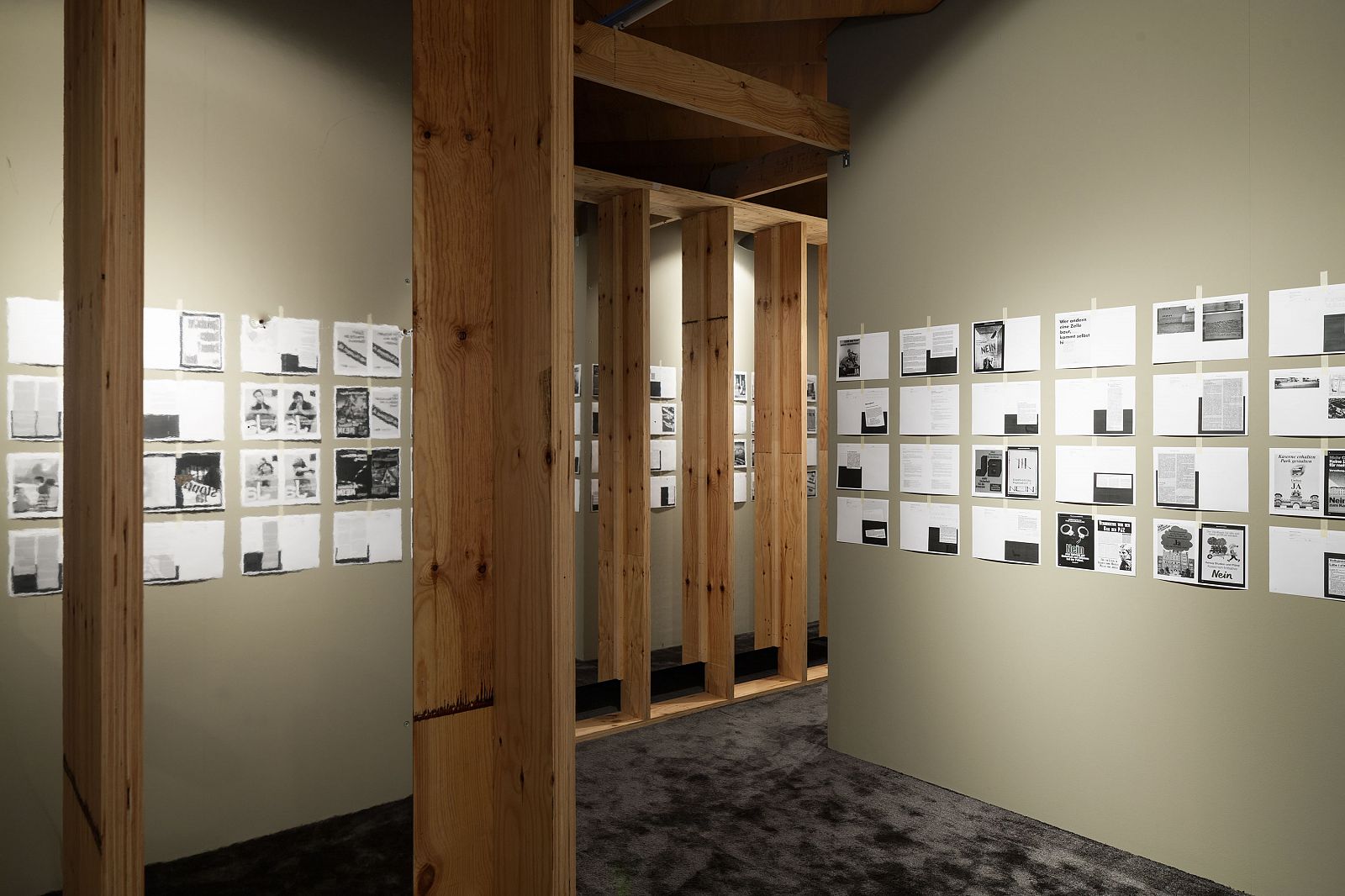 How do certain laws determine architectural possibilities? How can architects, in turn, shape those laws? This exhibition in the gta exhibition space at ETH Zurich presented both the film 0187.2 Legislating Architecture and the publication 0187.1 Legislating Architecture Schweiz. The pages of the book were attached to the wooden stud wall and the preliminary version of the ARCH+ issue on the same topic 0187.4 ARCH+ Legislating Architecture was made accessible on a touch screen. In parallel, the film Legislating Architecture was projected at the rear of the room. In order to provide seating to watch the film all books from the holdings of the ETH Library on the subject of “legislating architecture” (keywords: building law, laws, regulations, among others) were borrowed and fixed with packing foil to form 40 centimeter high stacks. In the foyer, the publication 0179.1 The Dialogic City—Berlin wird Berlin and Monumentalfilm were shown on a monitor.