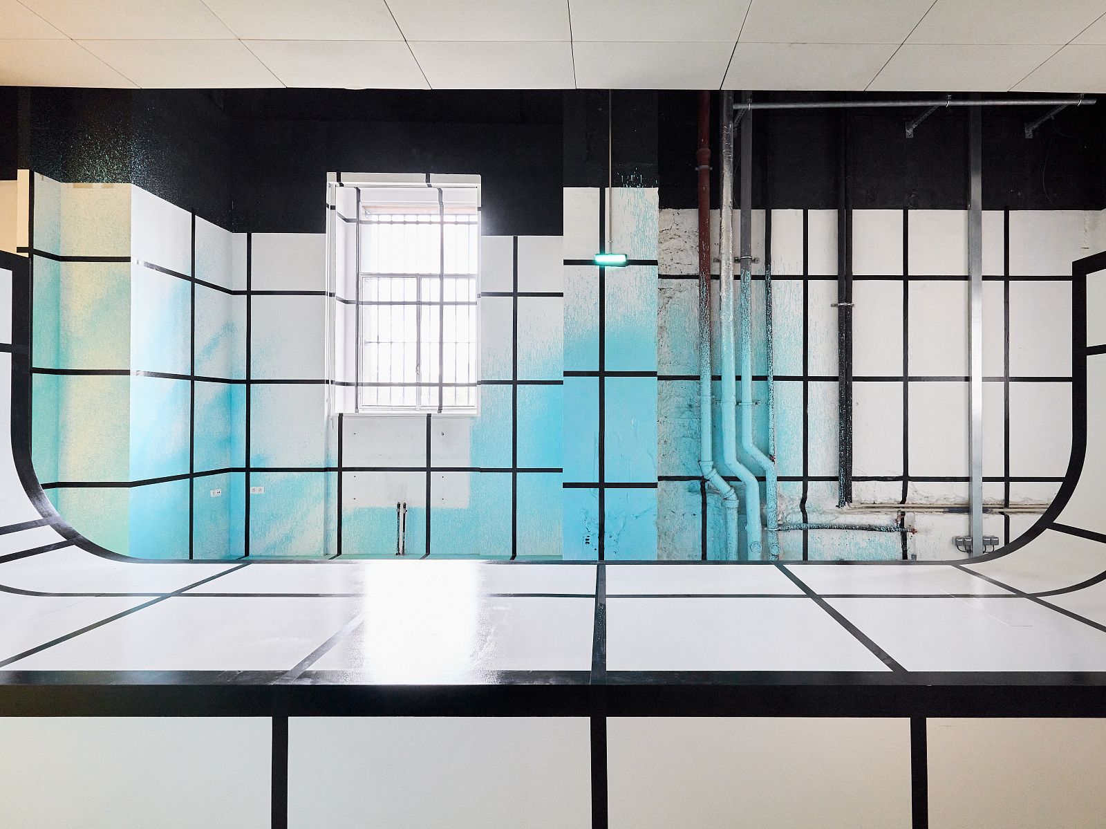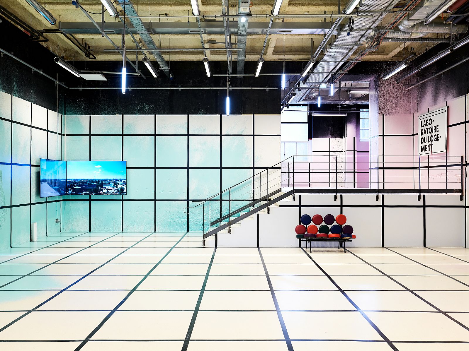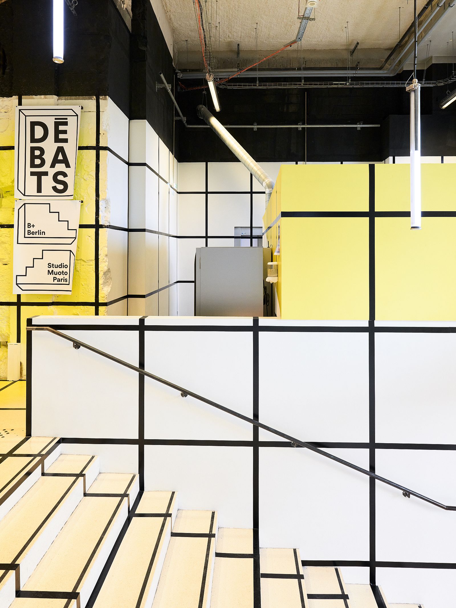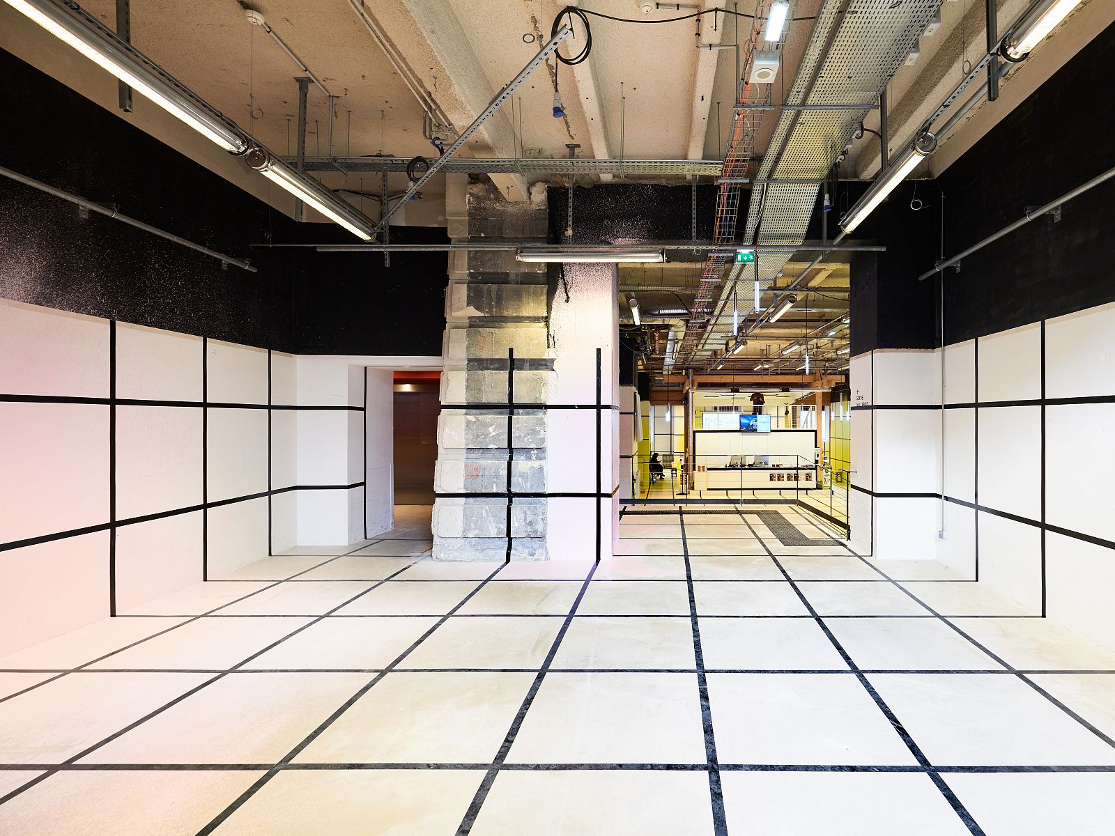 The installation of b+ in collaboration with Studio Muoto takes the form of a grid drawn on the floor, but also the walls – like a horizontal shelf, where each square corresponds to a component of the exhibition infrastructure. Some boxes are used, others are not. Those that are intended to accommodate devices are numbered to facilitate inventory. The grid lines and numbers are made of black adhesive tape. The devices displayed in the boxes are selected from existing storage, according to their availability, interest and suitability for display. As the inventory progresses, the boxes are emptied and filled. By bringing its exhibition infrastructure to the surface, the Cité de l’architecture reveals its hidden side and its invisible technical universe.