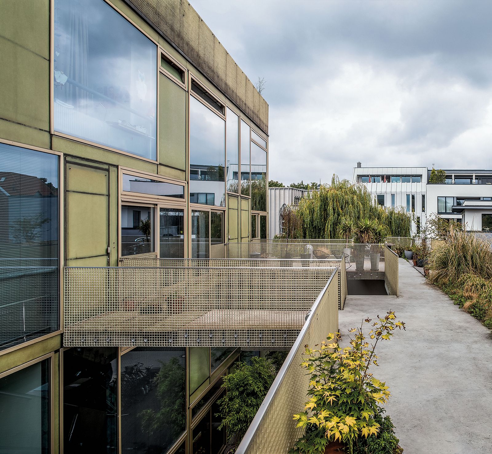 The interiors are characterized by the raw concrete walls and heavy oak floors; the absence of partition walls allows the user to individually configure the space. This idea of free use and self-development is also true for the bathroom and kitchen facilities since the only preinstalled elements are the shafts. The units are glazed on both the north and south sides, which emphasizes a sense of uninterrupted interior space. The facade consists of reinforced fiberglass elements that cover the concrete surfaces with greenish reflections. The modular concept of the project was adapted by the German electronic post-rock trio To Rococo Rot for an LP entitled Kölner Brett released by Staubgold records. This followed the idea that the building—and architecture more generally—can connect with other disciplines, which led to the project’s first publication in Rolling Stone magazine.