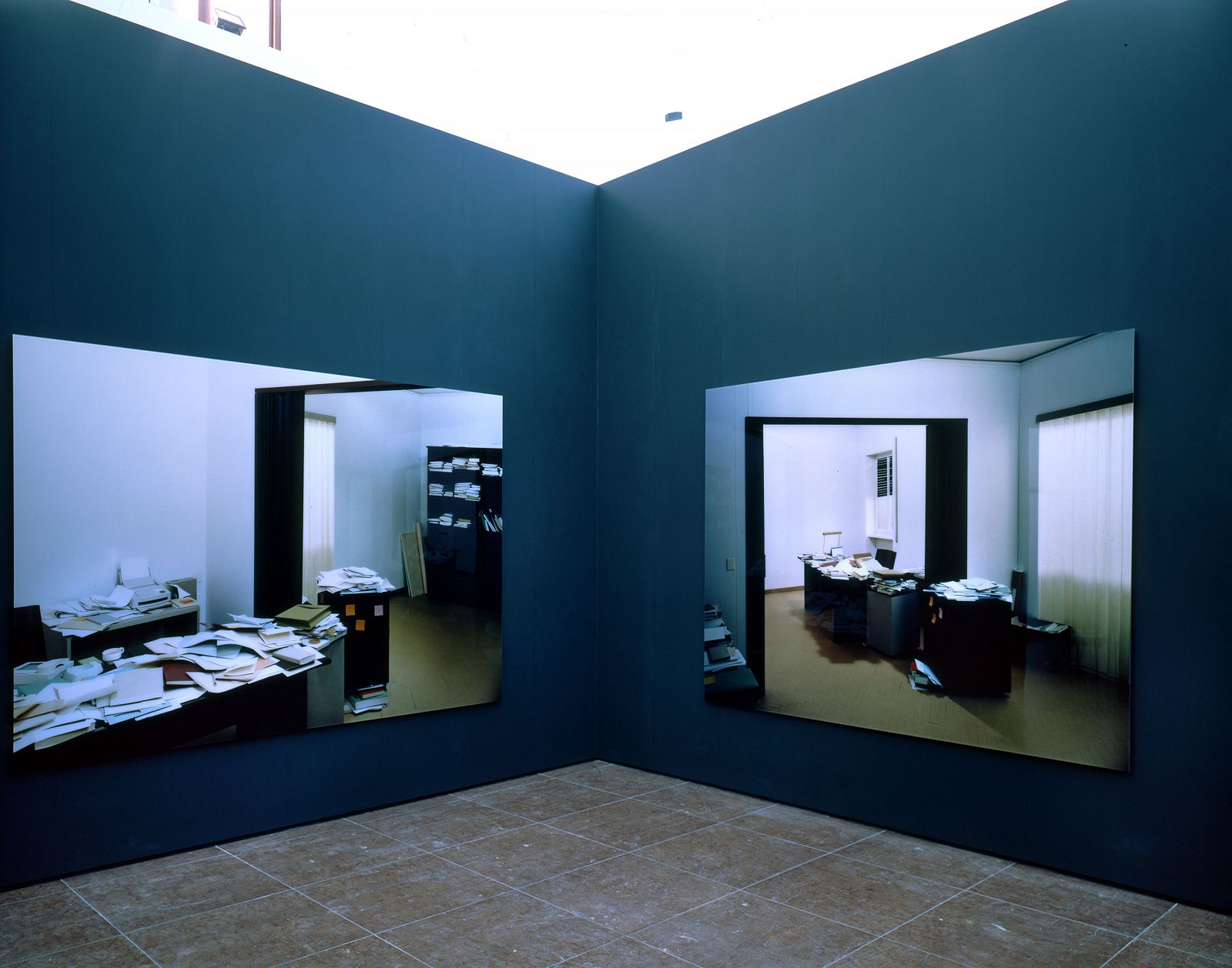 For his photo series Embassy, Thomas Demand gained access to the place where the events leading to this “smoking gun” supposedly occurred. Together with Arno Brandlhuber he later reconstructed the site as a 1:1 paper sculpture to take the photographic proof of these spaces of remembrance. In the same collaborative form, Thomas Demand and Arno Brandlhuber developed the first exhibition of Embassy as a spatial installation at the Fondazione Giorgio Cini presented by Fondazione Prada in Venice in 2007. The translation back into a physical exhibition set-up was neither a mere 1:1 reconstruction—as the paper sculpture produced before—nor a conventional white cube form of an exhibition. To indicate the spatial configuration of the actual embassy space, the walls were placed so as to align the spectator’s eye with Demand’s camera angle during his working process. The backdrop creates a cinematographic moment, in which the two-dimensionality of the images come into tension with the three-dimensionality of the rooms of the embassy in Rome. Beyond, the exhibition architecture refers to the scale of the models, which Thomas Demand usually destroys after taking the photographs. Guided by Brandlhuber’s architectural arrangement and Demand’s sequence of images, the visitor enters a construction, a manipulation of an unknown piece of recent history.