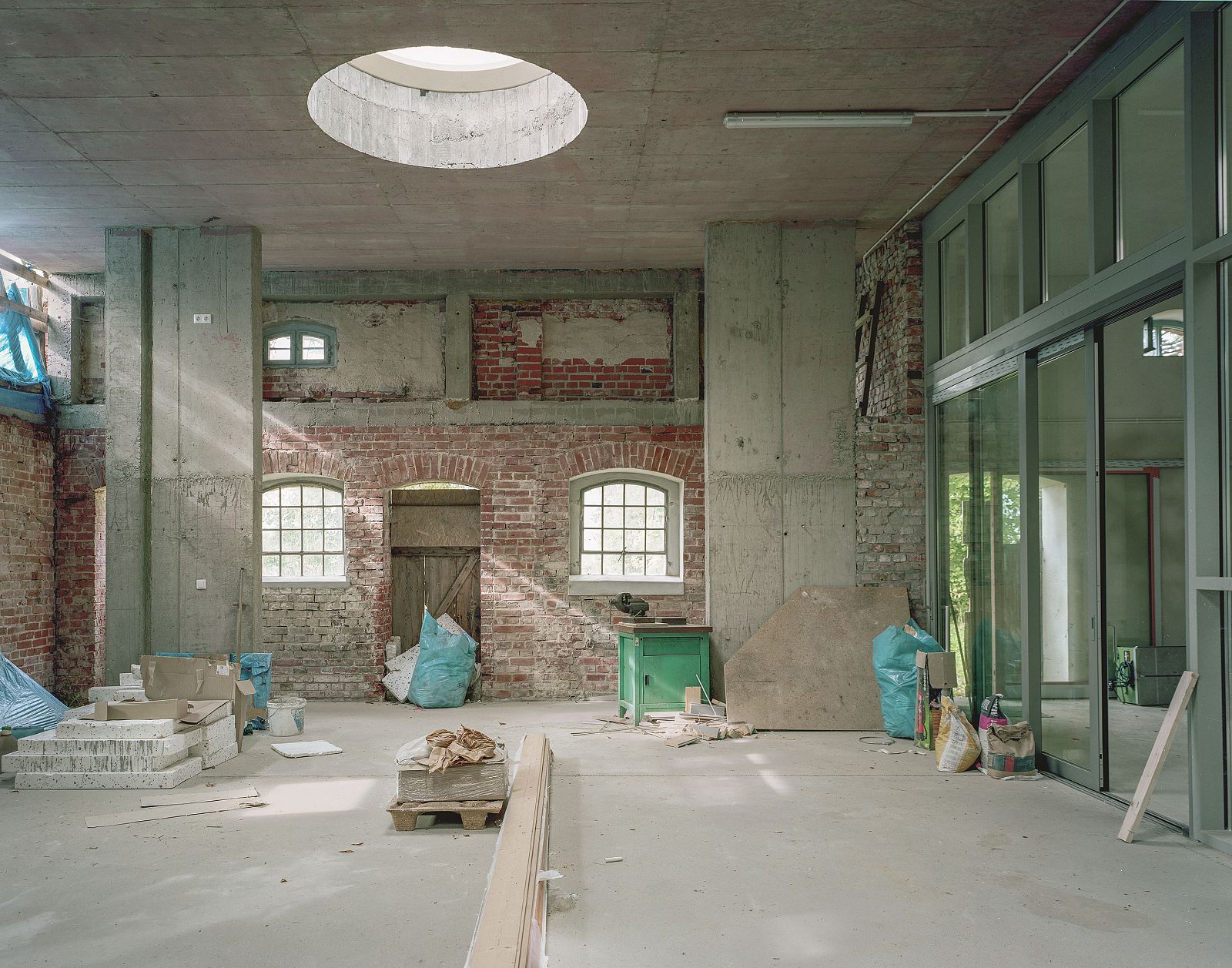 The project located in the small Polish village of Ninikowo is the reprogramming of a former stable into a studio. In collaboration with the artist and project initiator Manfred Pernice, the old half-timbered building was converted by inserting a concrete slab with large skylights in place of the collapsed roof, in a similar way to the principle applied in the conversion of 0145 St. Agnes in Berlin. As an autonomous supporting structure, the concrete slab replaced the roof without having to tear down the outer walls, which were no longer suitable for load transfer. One of the building’s gable ends was also preserved with the help of a sculptural support designed by Manfred Pernice: three concrete buttresses now reinforce the remaining framework. The concept was developed in close collaboration with Manfred Pernice, who carried out part of the construction himself. Moreover, it was not a commission in the conventional sense. “It was also a case of first aid and special assistance provided on site,” says Pernice. “Assessing the state of the structure, exploring possibilities, exchanging ideas, and engaging in conversations about it. This was an essential, helpful, and important process.”