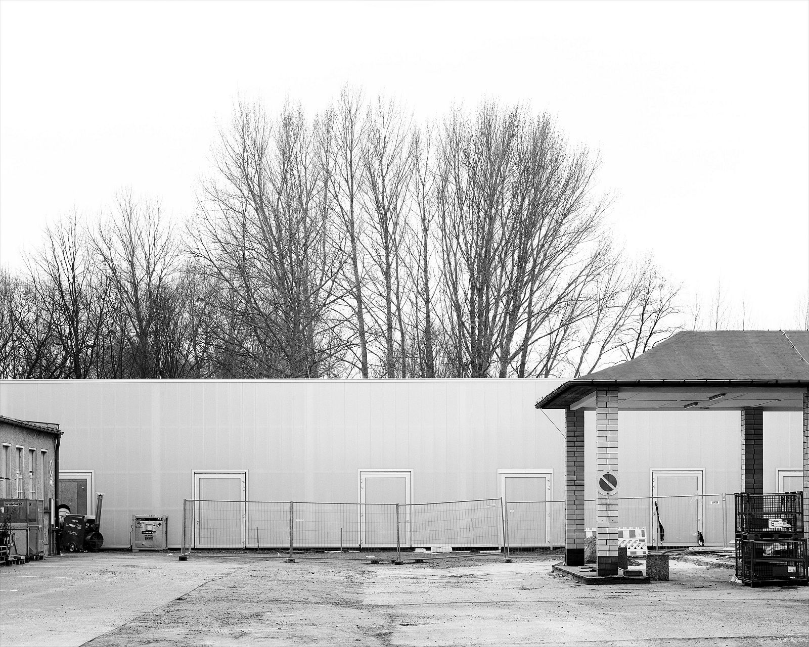 With the reunification of Berlin, the chauffeur service for GDR officials was taken out of service and its premises, the Fahrbereitschaft, fell into disuse. Located in Berlin-Lichtenberg, the site encompasses 13 historical buildings, reminiscent of the towers of 0154 San Gimignano Lichtenberg. They included numerous garages, car workshops, a petrol station, and a casino with a ballroom and other cultural facilities. The clients, conceptual art collectors and progenitors of the Haubrok Foundation, decided to develop the large area whilst preserving the existing fabric. The concept thus envisaged a mixed-use complex—juxtaposing production with art—aimed at reusing the existing structures and providing studio space for affordable rents. Two new buildings were to be added to the site: a 108-meter-long pavilion for commercial use that is aligned with the southern border of the plot and a square building for art storage (0182.1 Fahrbereitschaft Lichtenberg: Schaulager) located next to the entrance to the area. In spring 2018 the long pavilion, Fahrbereitschaft Lichtenberg: Gewerbe, was completed.