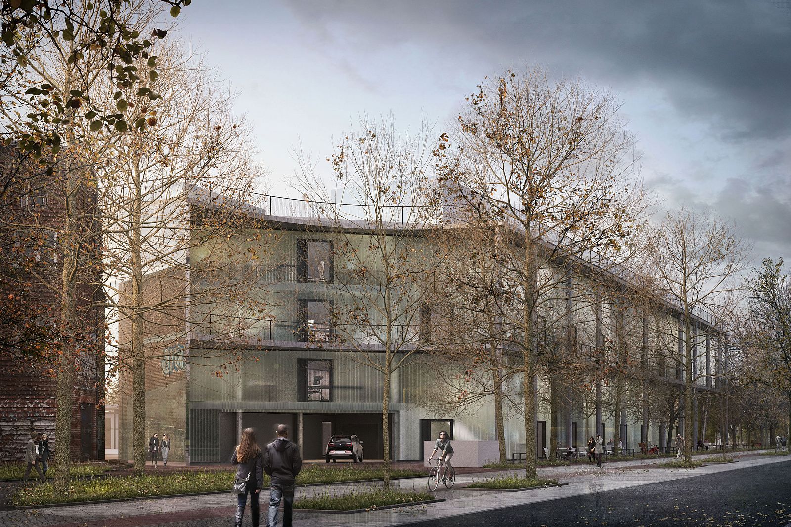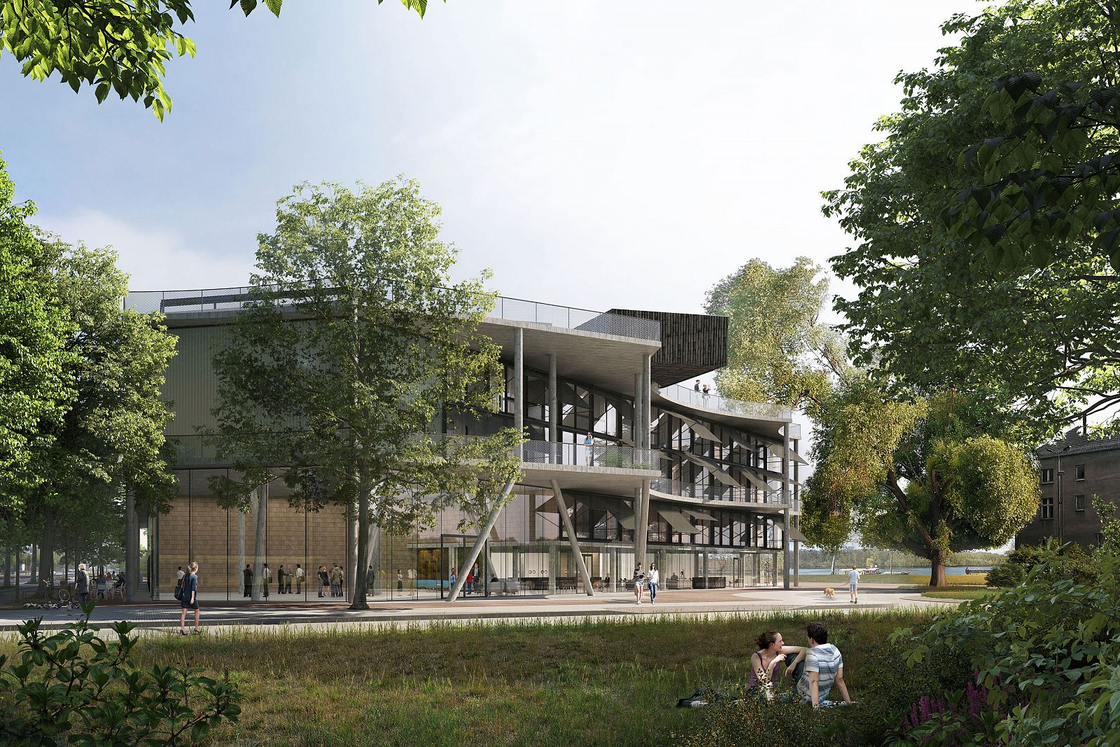 The commercial building is part of an ensemble with new and converted studio and office spaces in Berlin-Lichtenberg, situated on the banks of the river Spree. Between the 1920s and the 1940s, the site was the location of Berlin’s largest outdoor swimming pool, featuring water warmed with waste heat from the nearby Klingenberg thermal power station. Later on, the customs authority of the GDR was based there until 1990. The shape of the building is determined by three givens: a roundabout, that was formerly used to facilitate the access of the property during the presence of the East German customs authority on the site, several trees that are worthy of protection, and the required distance to a listed adjacent building. Despite the different types of influencing factors—road planning, tree population, monument protection—the curved segments create a formal coherence.