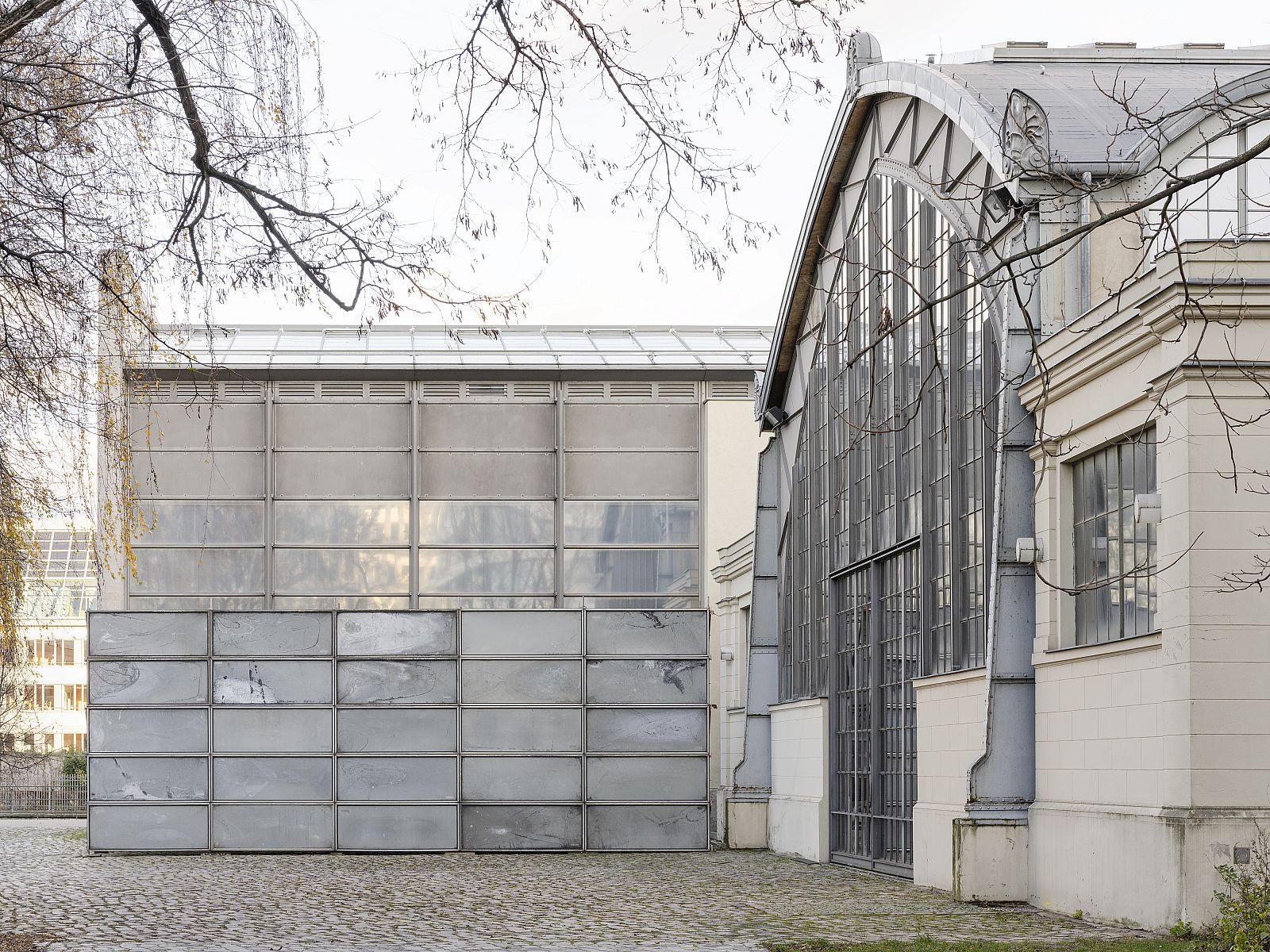 For the exhibition Church for Sale, the architectural intervention addresses the exhibition's themes with critical reference to the development plan drawn up for the area around the Hamburger Bahnhof. Further, it draws attention to the continuing lack of clarity regarding the future of the ensemble of buildings used by the Museum für Gegenwart which consists of the historic main building and the Rieckhallen. The two-dimensional line arising from the alignment of the adjacent buildings' boundary in the development plan is translated into a three-dimensional wall that divides the historic hall in two along the north-south axis. The wall has been constructed from reusable material commonly used to enclose building sites. This architectural intervention can be understood as a reference to the fact that the sustainable safeguarding of the museum as a public space and a place to experience art, enjoy reflection and polyphonic discussions that is accessible to all cannot be taken for granted.